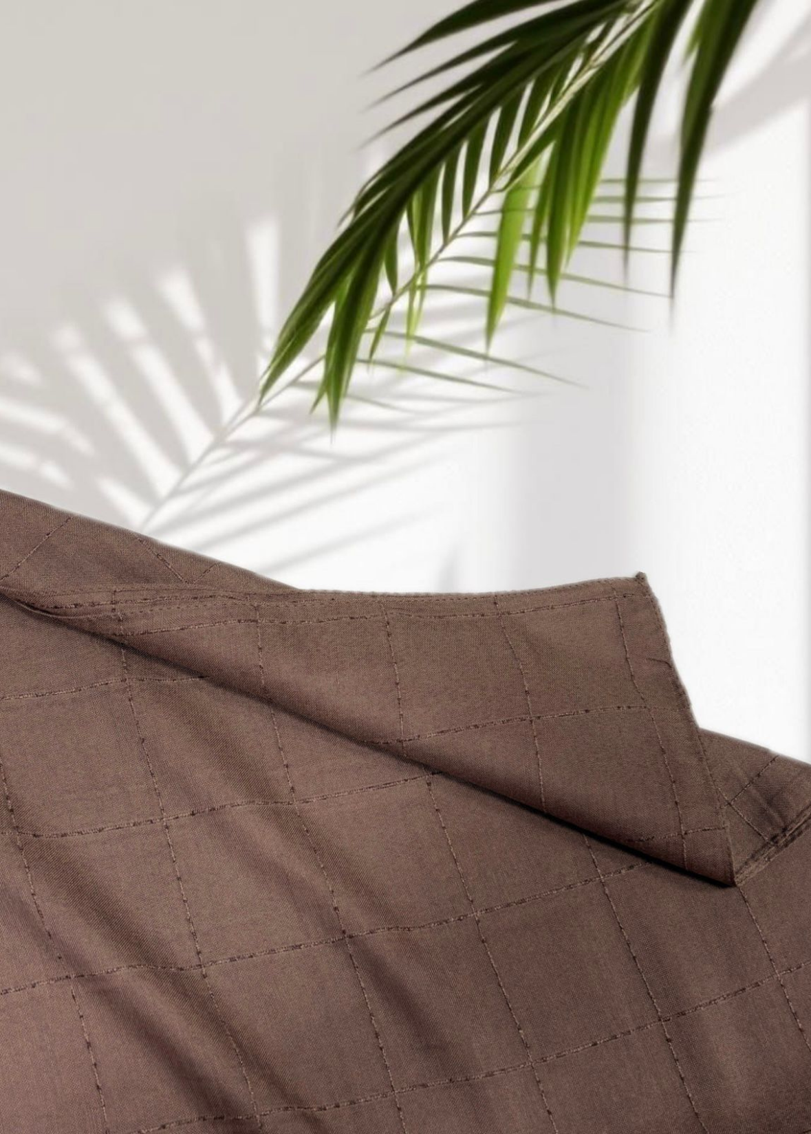 Zarafetin ve sadeliğin buluştuğu bu özel şal,yumuşak dokusuyla hem gündelik hem de özel kombinlere sofistike bir dokunuş katıyor. Kare desenli dikiş yapısı, geometrik sadeliği modern bir estetikle buluştururken, doğal ışık altında oluşan palmiye gölgeleriyle çekilen görseli, ürünün dingin ve rafine karakterini vurguluyor.